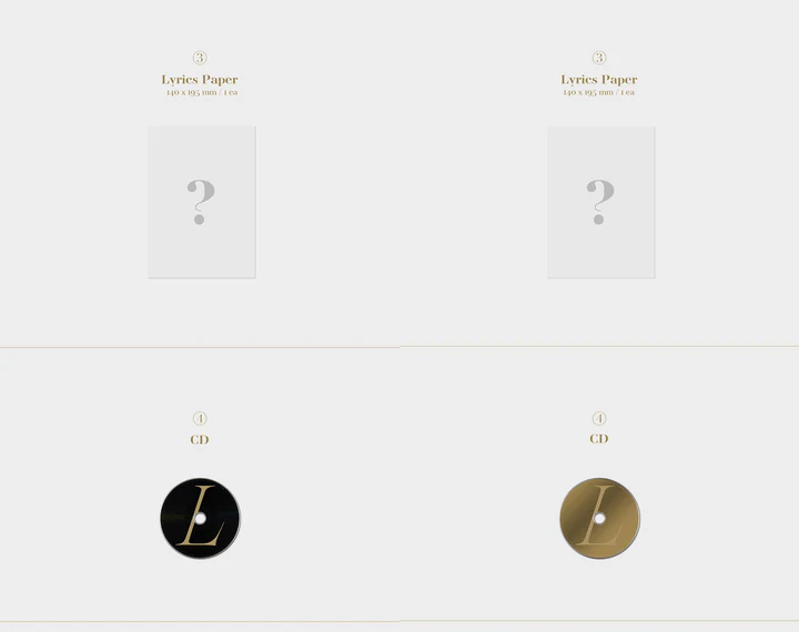 – 구성 : 패키지박스 + CD + 포토북 (88p) + 가사지(1ea) + 랜덤 포토카드 (1 of 4) + 랜덤 폴라로이드 (1 of 4) + 양면 포스터 (1ea / First Press Only) + 랜덤 레어 골드 포토카드 (1 of 4 / First Press Only) + 레어 골든 티켓 (1ea / Only 50ea)