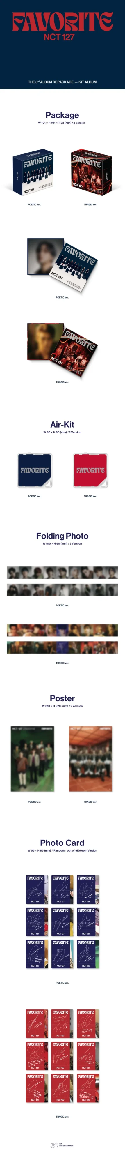 NCT 127 정규 3집 리패키지 ‘Favorite’은 동명의 타이틀 곡 ‘Favorite’을 비롯한 ‘Love On The Floor’, ‘Pilot’ 등 신곡 3곡과 정규 3집에 수록된 11곡까지 총 14곡으로 구성, NCT 127의 다채로운 음악 색깔을 만나기에 충분하다.